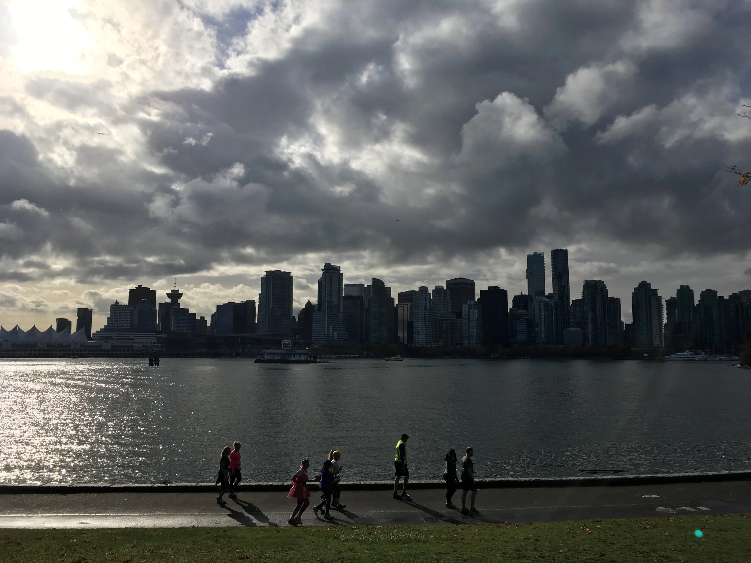 By this point I had lost that group I was with. Two guys fell off, and the other two pulled ahead. I stayed steady. By kilometre 14, I decided it was time to fire up the legs a bit. With 8 kilometres to go, I picked up my pace a bit, running a 3:54 kilometre - a bit faster than I wanted, but it felt pretty good, so I did another. And then another. I kept expecting that this pace would catch up to me and the inevitable pain was right around the corner, but it never came. The kilometres were flipping by at this point and I felt strong and fast. After five consistently fast kilometres with paces ranging from 3:54 - 3:57 I only had three kilometres to go. As the course turned back towards the city along the seawall, I caught up to and promptly passed a group of 5 guys, including a few of the guys that had pulled away from my group earlier on. This whole negative split thing was working out pretty well.